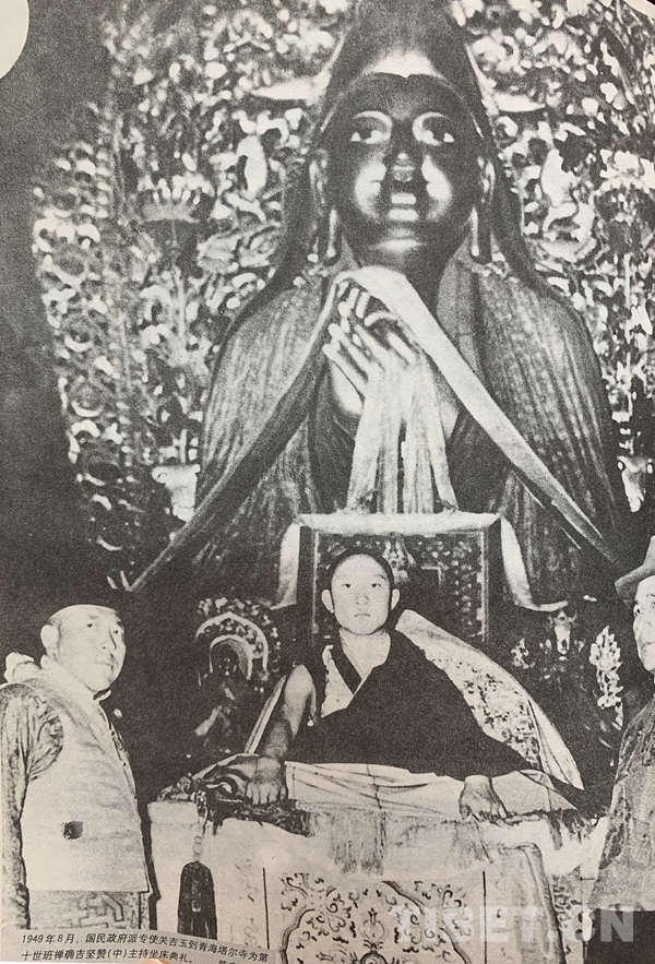 1949年8月,國(guó)民政府派專(zhuān)使關(guān)吉玉到青海塔爾寺為十世班禪額爾德尼o確吉堅(jiān)贊(中)主持坐床典禮。(圖片翻拍自《金鑰匙o(hù)十七條協(xié)議》 陳宗烈提供)