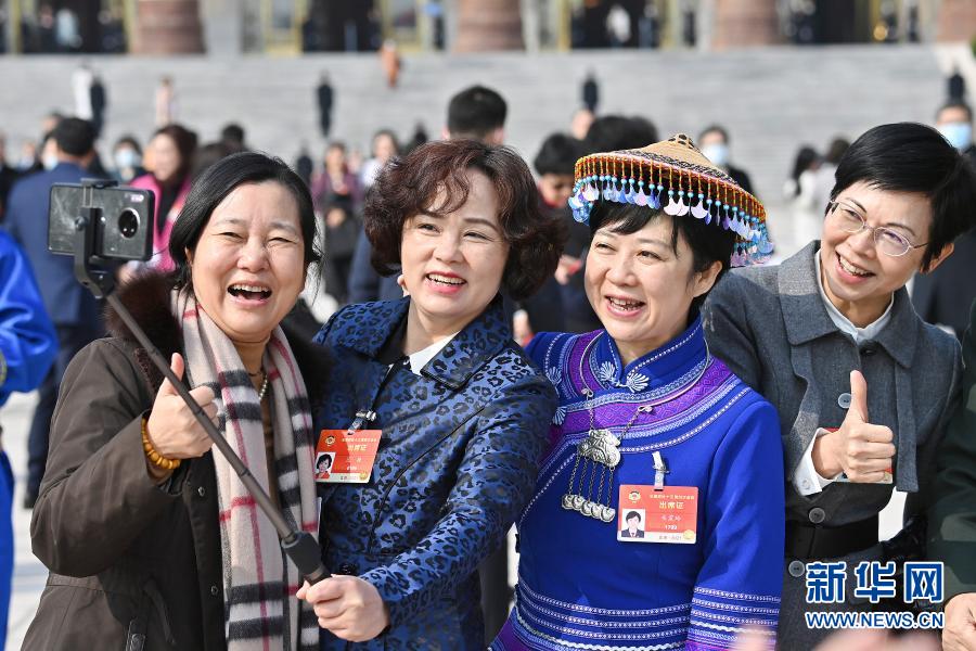 3月7日,全國政協(xié)十三屆四次會(huì)議在北京人民大會(huì)堂舉行第二次全體會(huì)議。這是會(huì)議結(jié)束后,政協(xié)委員夏寧、區(qū)捷、韋震玲、楊靜華(從左至右)在人民大會(huì)堂外合影。新華社記者 李鑫 攝