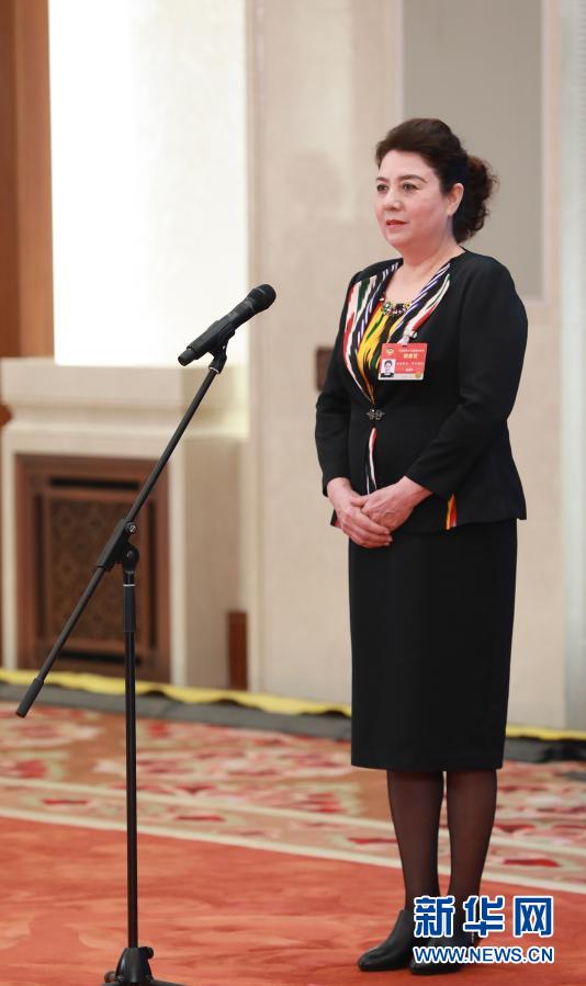 3月10日,全國政協(xié)十三屆四次會議第三場“委員通道”采訪活動在北京人民大會堂新聞發(fā)布廳舉行。這是全國政協(xié)委員古麗帕麗·阿不都拉通過網(wǎng)絡視頻方式接受媒體采訪。新華社記者 王南 攝