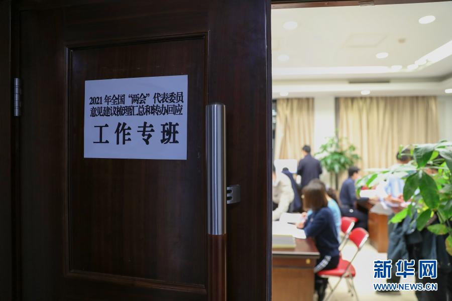 3月5日,2021年全國(guó)兩會(huì)代表委員意見(jiàn)建議梳理匯總和轉(zhuǎn)辦回應(yīng)工作專(zhuān)班的工作人員在忙碌。新華社記者 李木子 攝