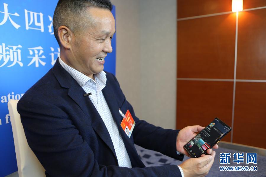 3月3日,全國(guó)人大代表、福建永泰縣希安油茶專(zhuān)業(yè)合作社負(fù)責(zé)人盧玉勝在駐地接受采訪時(shí)展示他為宣傳油茶開(kāi)通的社交媒體賬號(hào)。新華社記者 吳雨 攝